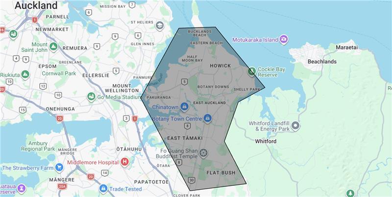 Howick, Pakuranga, Botany Downs, Flat Bush, East Tamaki, Half Moon Bay, Bucklands Beach, Highland Park, Dannemora, Cockle Bay, Shelly Park, Mellons Bay, Farm Cove, Sunnyhills, Pakuranga Heights, Pigeon Mountain